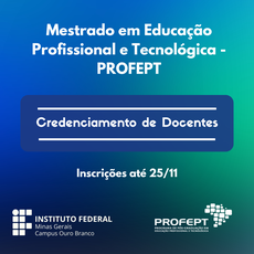 O Mestrado Profissional em Educação Profissional e Tecnológica (ProfEPT) ofertado pelo IFMG Campus Ouro Branco está com inscrições abertas, até 25 de novembro, para a seleção de docente a ser credenciado pelo programa que conta com duas linhas de pesquisa e suas linhas de pesquisa: "Práticas Educativas em Educação Profissional e Tecnológica" e "Organização e Memórias de Espaços Pedagógicos na Educação Profissional e Tecnológica".