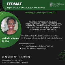 A Especialização em Educação Matemática do IFMG - Campus Sabará tem o prazer de convidar toda a comunidade acadêmica para a defesa do Trabalho de Conclusão de Curso da aluna Lucineia Máxima da Silva, orientada pela Profa. Ma. Débora Silva Veloso Rocha e coorientada pela Profa. Ma. Daila Silva Seabra de Moura Fonseca.