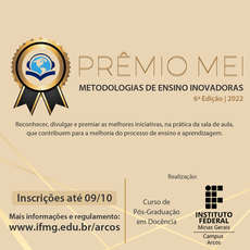 Estão abertas as inscrições para 6ª Edição do Prêmio MEI de Docência. O Prêmio MEI - Metodologias de Ensino Inovadoras - é uma iniciativa do Curso de Pós-Graduação em Docência do IFMG Arcos. E tem como objetivo reconhecer, divulgar e premiar as melhores iniciativas, na prática da sala de aula, que contribuem para a melhoria do processo de ensino e aprendizagem.