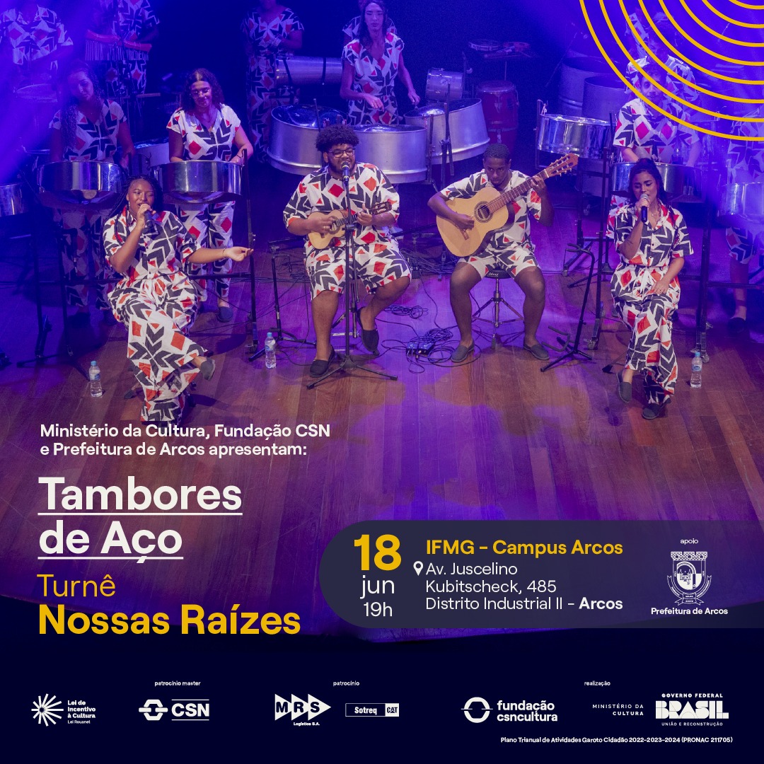 No dia 18 de junho, às 19 horas, o estacionamento do IFMG se encherá de samba e alegria com a turnê Nossas Raízes do grupo Tambores de Aço. Trata-se de um grupo musical da Fundação CSN que possui um repertório eclético, influenciado pela música brasileira, caribenha e latino-americana.