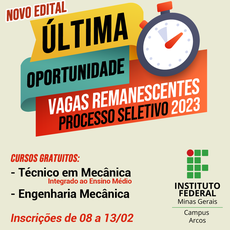 O IFMG Arcos lançou nesta terça-feira,7, novo edital do processo seletivo 2023 para vagas remanescentes dos cursos: Técnico em Mecânica Integrado ao Ensino Médio e Engenharia Mecânica.