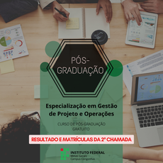 Comunicamos que o prazo para matrícula da segunda chamada do Curso de Pós-Graduação em Gestão de Projetos e Operações ocorrerá nos dias 10/01/2023 e 11/01/2023 das 13h00min às 19h00min, na Gerência de Pesquisa, Inovação e Pós-Graduação do IFMG – Campus Congonhas.