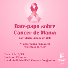 Será realizada na próxima segunda-feira, dia 21 de outubro, às 13 horas no Auditório do Campus Congonhas, um bate papo sobre a luta contra o câncer de mama no IFMG Campus Congonhas. Na ocasião, contaremos com o depoimento da servidora do Campus Ouro Preto e fotógrafa, Simone de Melo, que enfrenta a doença.