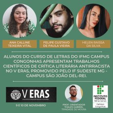 Os alunos Ana Calline Teixeira Vital, Felipe Gustavo de Paula Vieira e Helen Raissa da Silva Graduandos do curso de Letras do IFMG Campus Congonhas irão apresentar trabalhos científicos de crítica literária antirracista no V ERAS, promovido Pelo IF Sudeste MG - Campus São João del-Rei.