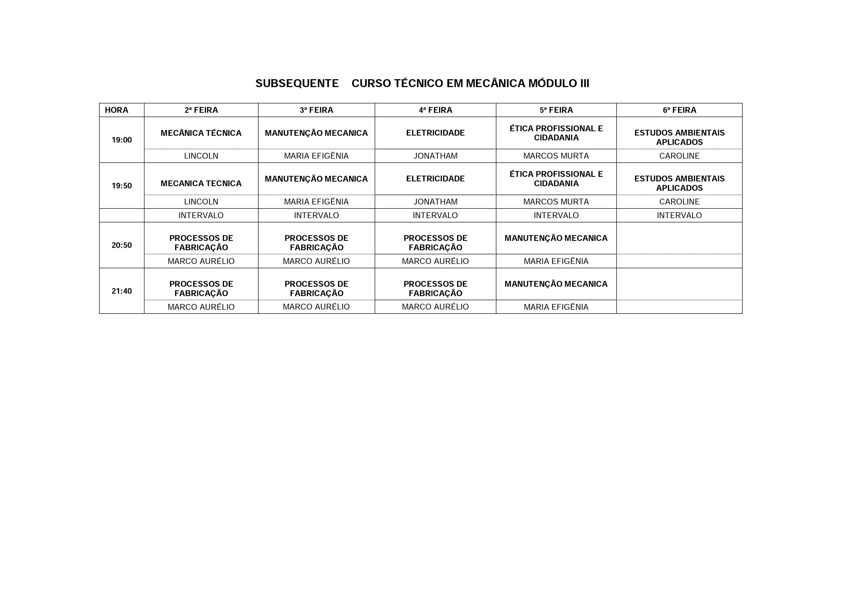 Horários de aulas
