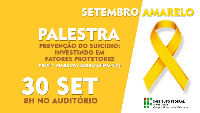 Dando prosseguimento às ações do Setembro Amarelo, o IFMG – Campus Governador Valadares promove nos dias 26, 29 e 30 deste mês palestras sobre a temática.