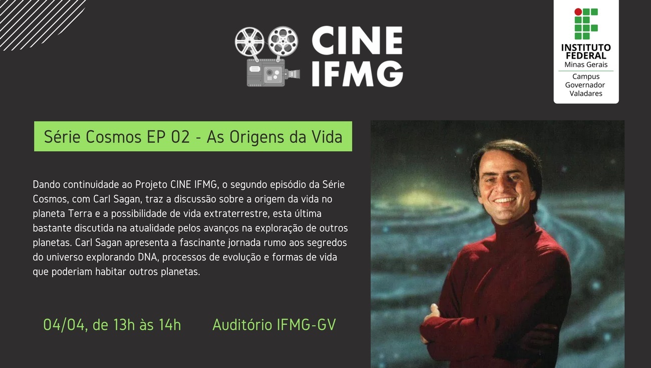 O segundo encontro do projeto CINE IFMG acontece nesta quarta-feira, 04 de abril, às 13h, no auditório do IFMG - Campus Governador Valadares. Contará com a exibição do Episódio 2 - As origens da vida - da Série Cosmos, de Carl Sagan.