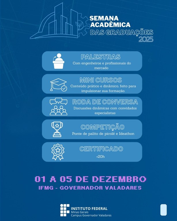 Evento gratuito e aberto também à comunidade externa será realizado entre os dias 1º e 6 de dezembro. Programação contará com palestras, minicursos, Ideathon e concurso de ponte de palitos de picolé. Garanta sua inscrição!