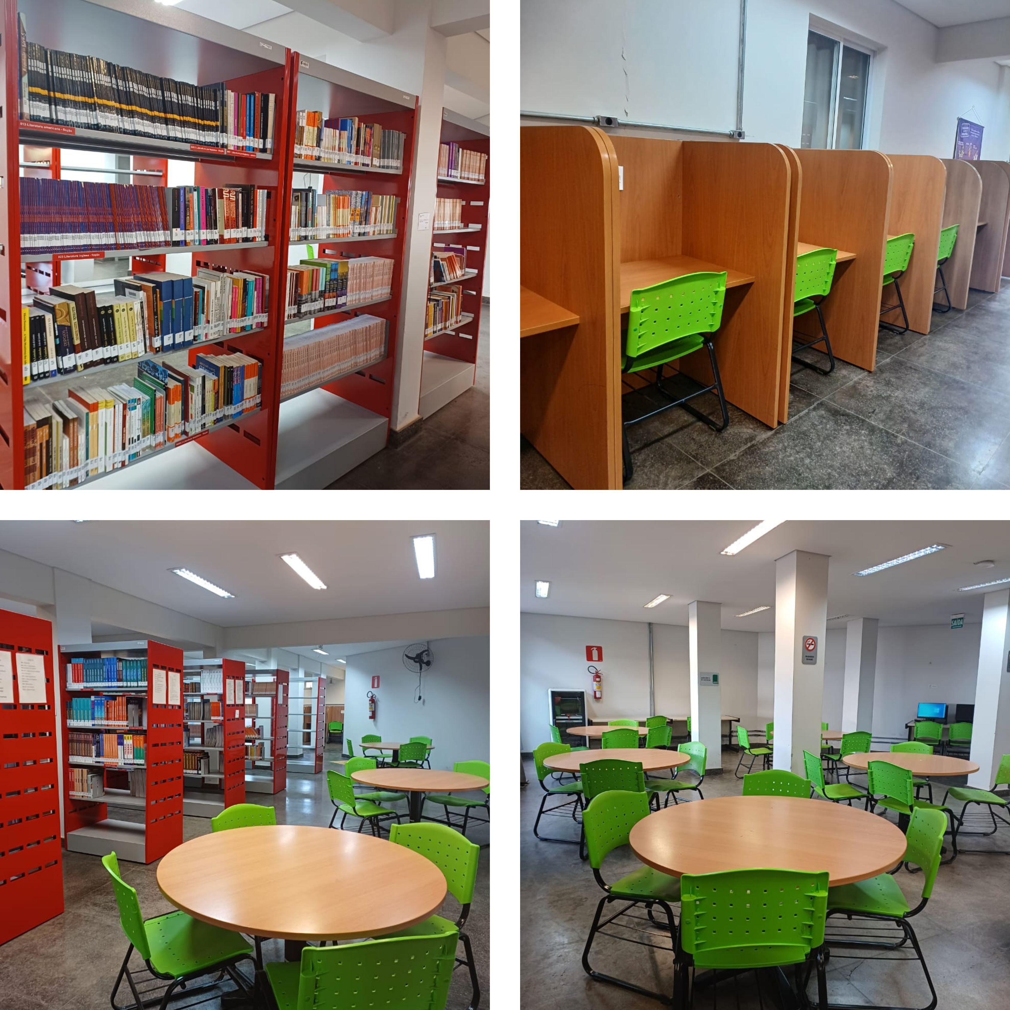 Na biblioteca, os usuários têm à sua disposição 08 (oito) computadores com acesso à internet para utilização do acervo digital e bases de dados virtuais. Os usuários dispõem também de 01 (uma) sala de estudos em grupo com capacidade para até 10 pessoas, 05 (cinco) mesas para estudos em dupla, 07 (sete) mesas para estudos em grupo e 54 (cinquenta e quatro) assentos, em número suficiente às demandas dos cursos. O acervo, por sua vez, é composto para atender integralmente ao projeto pedagógico dos respectivos cursos, disponibilizando aos alunos os títulos descritos nas ementas das disciplinas.