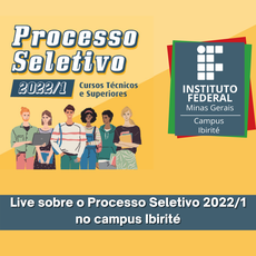 A live será transmitida em nosso canal no Youtube (www.youtube.com/ifmgibirite) e tem o objetivo de apresentar os cursos ofertados no IFMG campus Ibirité à comunidade, incentivando a participação no processo seletivo. Durante a live serão também respondidas perguntas e dúvidas sobre os cursos e sobre o processo seletivo 2022/1.