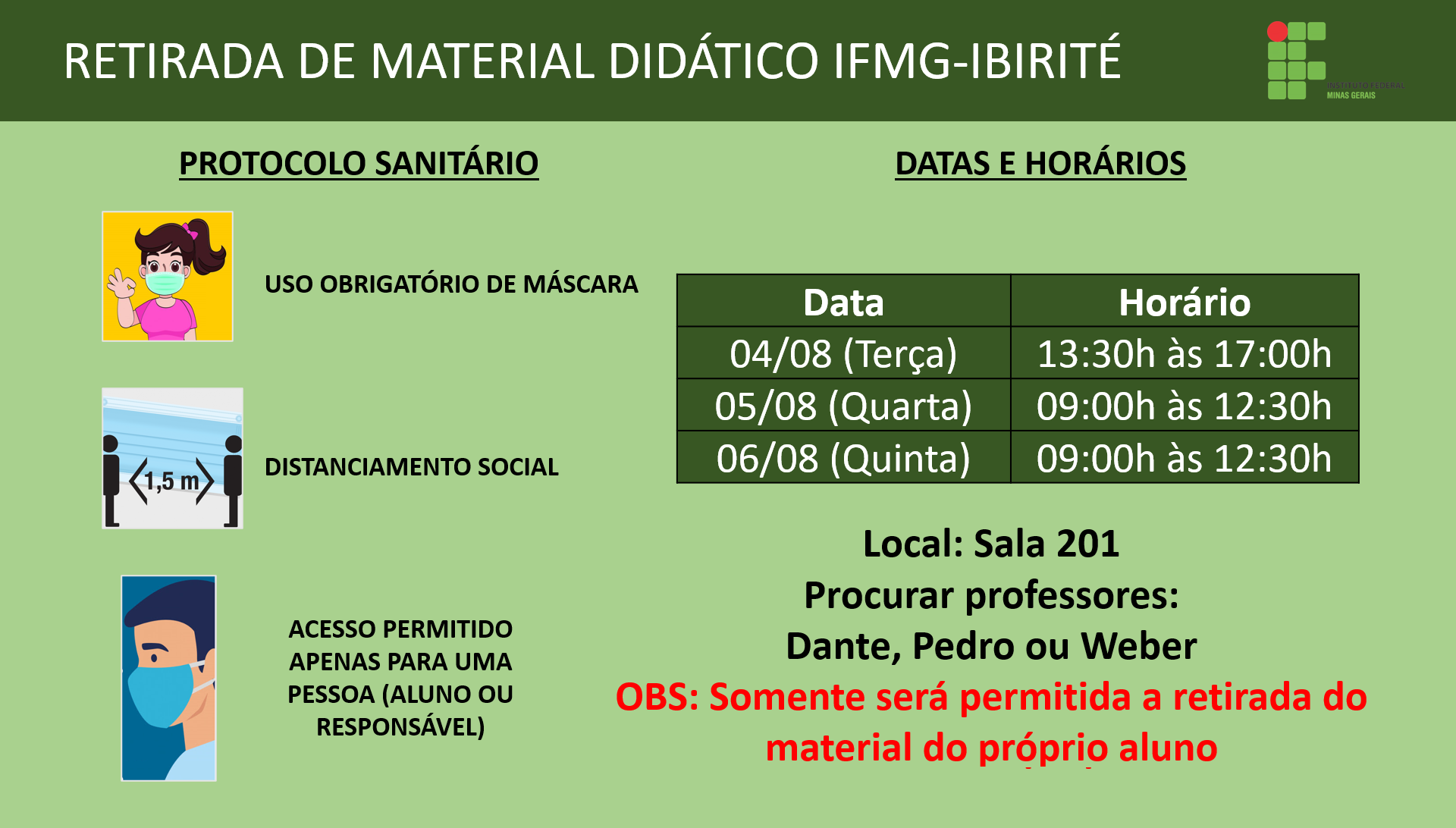 Informamos aos alunos que tenham algum material ou pertence que tenha ficado nos armários escaninhos do campus IFMG-Ibirité, que será permitida o acesso ao campus para fazer a retirada de tais materiais didáticos e/ou pertences.