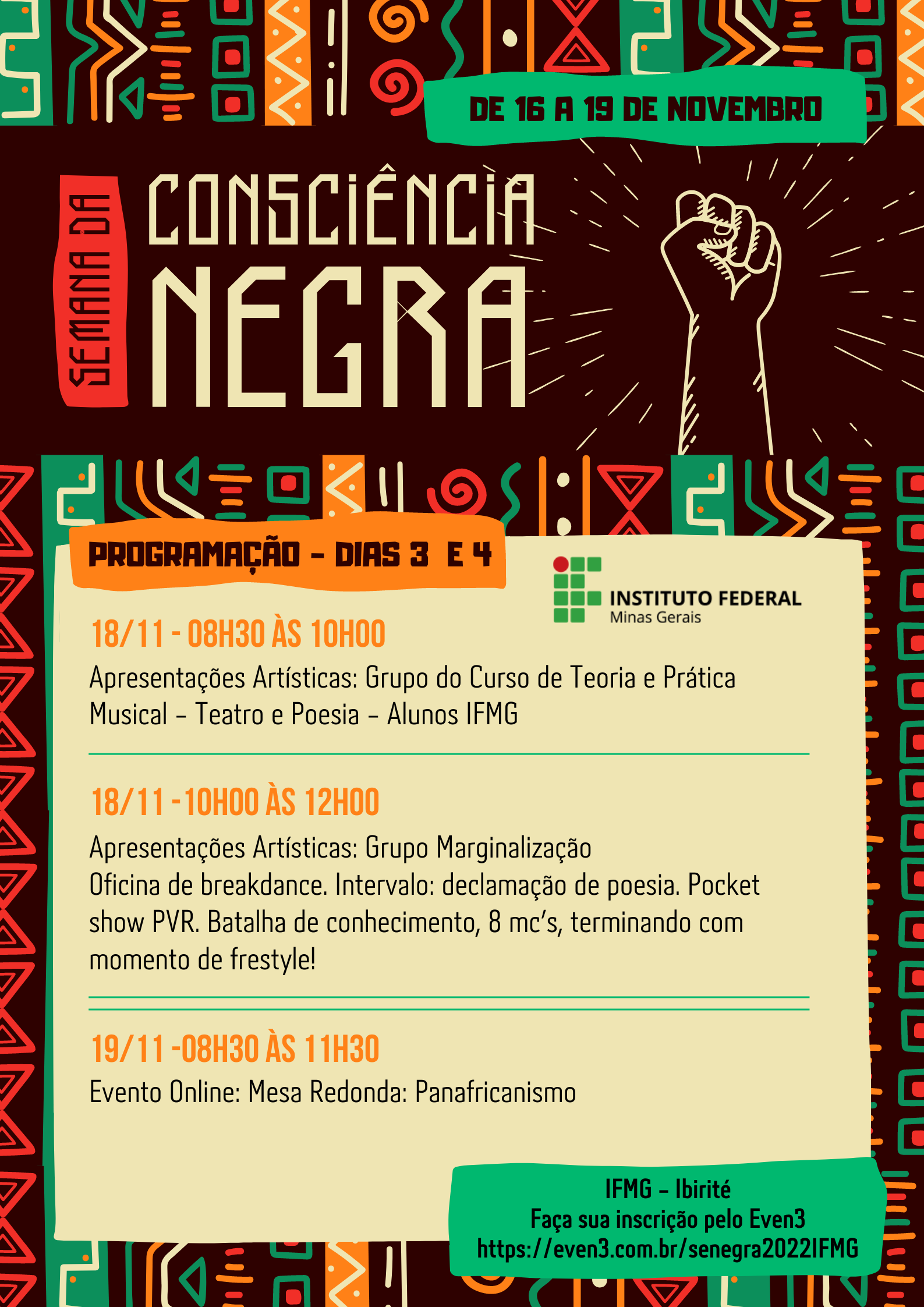 Por meio de ações acadêmicas, culturais e sociais, a proposta é atuar para a valorização da identidade e cultura negra, evidenciando o combate ao racismo e suas práticas, além de auxiliar na construção de relações étnico-raciais democráticas e respeitosas no IFMG e em escolas públicas de diversos municípios. "Para isso, foi construída uma agenda sistemática de atividades em alusão ao dia 20 de novembro, o Dia da Consciência Negra, buscando o fortalecimento da implementação das leis 10.639/03 e 11.645/08 no âmbito do IFMG", explica uma das coordenadoras do evento, a profa. Samira dos Santos Ramos.