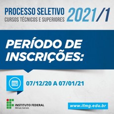 Termina na próxima quinta-feira, 7 de janeiro, o período de inscrições do Processo Seletivo 2021/1. Neste vestibular para ingresso de novos alunos no primeiro semestre letivo de 2021, são oferecidas 3.720 vagas em 88 cursos técnicos e de graduação. Todos os cursos são gratuitos.