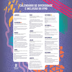 O IFMG lançou o seu calendário de Diversidade e Inclusão. A ação busca chamar atenção da comunidade para datas que contemplam os cinco pilares com os quais o Setor de Diversidade e Inclusão da instituição vem trabalhando no momento: gênero/identidade de gênero; raça/etnia; pessoas com deficiência; diversidade sexual/LGBTQIAPN+; gerações/etarismo.