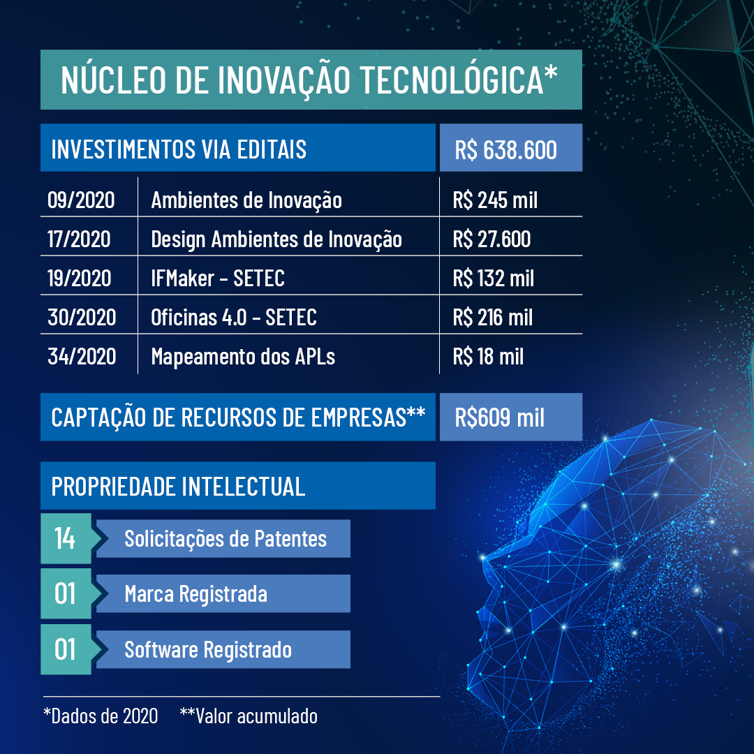 Em relação à proteção do conhecimento, o NIT atua na prospecção tecnológica, na consultoria para elaboração de projetos em inovação, captação de recursos, orientação e capacitação, pedidos de proteção e comercialização de tecnologia. Em 2020, o IFMG já investiu R$350 mil em editais de fomento à inovação, captou R$609 mil junto às empresas, além de ter solicitado 14 registros de patentes.
