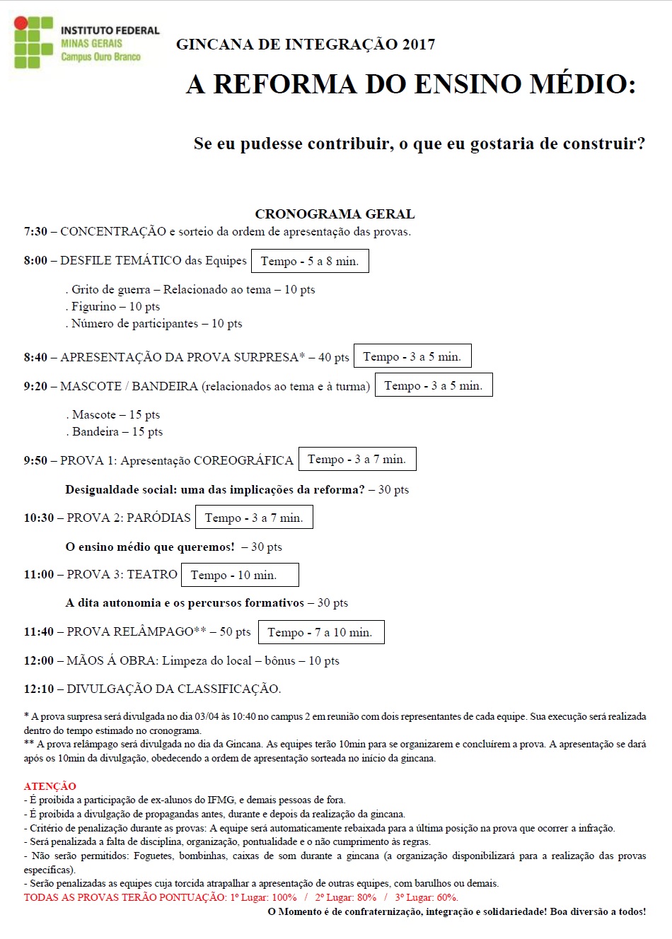Técnicos- Integrados se preparam para mais uma Gincana anual IFMG, esse ano o tema é "A reforma do ensino médio" e o lema é "Se eu pudesse contribuir, o que eu gostaria de construir" . Como uma das ações, os alunos estão recolhendo materiais recicláveis e alimentos não perecíveis, são 3 equipes , cada uma composta por uma série e um curso distinto que disputam o título de campeã.