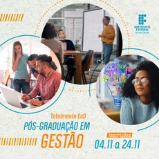 Estão abertas as inscrições, até o dia 24 de novembro, para a Especialização em Gestão com ênfases em Empreendedorismo e Negócios; Estratégia e Marketing e Tecnologia e Inovação está com inscrições abertas. A pós-graduação lato sensu é gratuita e será ofertado à distância.