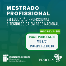 Foram prorrogadas, até o dia 9 de janeiro de 2024, as inscrições para o Mestrado Profissional em Educação Profissional e Tecnológica (ProfEPT). Neste ano, são ofertadas 654 vagas distribuídas entre 39 instituições associadas de todo o Brasil, sendo 14 vagas no IFMG Campus Ouro Branco. As vagas são destinadas à ampla concorrência e aos servidores do quadro permanente ativo da Rede Federal de Educação Profissional, Científica e Tecnológica e Colégio Pedro II.