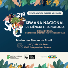 Nesta terça-feira, dia 22 de outubro, às 19 horas, será realizada a Mostra Biomas do Brasil, tema da Semana Nacional de Ciência e Tecnologia 2024. O objetivo do evento é apresentar, para estudantes e demais interessados, os biomas brasileiros por meio de sua diversidade, despertando a curiosidade e valorizando a riqueza nacional.