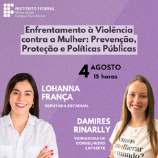 O debate será conduzido pela Deputada Estadual Lohanna França e pela vereadora de Conselheiro Lafaiete, Damires Rinarlly.