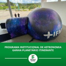 O planetário móvel é a novidade deste ano. Trata-se de uma instalação com capacidade para 40 pessoas por sessão e que mede aproximadamente 6m de diâmetro e 3,5m de altura. Nesta primeira etapa, o planetário irá percorrer todos os campi do IFMG para que servidores e estudantes possam conhecer o projeto e, caso tenham interesse, também integrem a equipe. As datas serão divulgadas no perfil do Instagram @maisifmg. Após isso, o planetário ficará mais tempo alocado em um campus, promovendo oficinas, sessões comentadas e aulas.