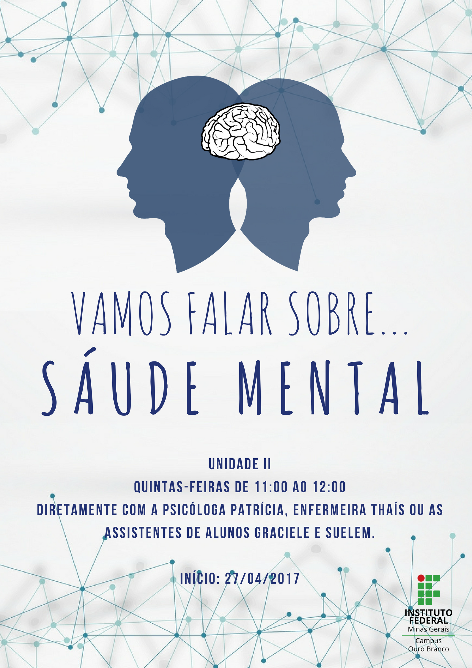 Alunos e comunidade acadêmica do IFMG - Ouro Branco, no mês de abril foi comemorado o dia mundial da saúde e a Organização Mundial da Saúde (OMS) recomendou ações de prevenção à depressão. Vemos que é urgente abordar esta temática dado os últimos fenômenos midiático "Jogo da Baleia Azul" e a série "Os 13 porquês". Diante disso convidamos vocês para participar conosco do projeto " Vamos falar sobre ... SAÚDE MENTAL.