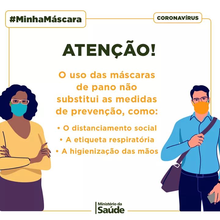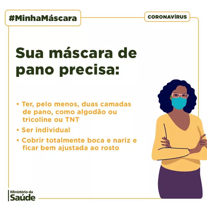 O Ministério da Saúde passou a recomendar a utilização de máscaras caseiras para toda a população. As máscaras devem ser utilizadas quando for necessário sair de casa e devem ser usadas por todos, incluídos aqueles que não estão nos grupos de riscos ou não tem nenhum sintoma e querem se proteger.