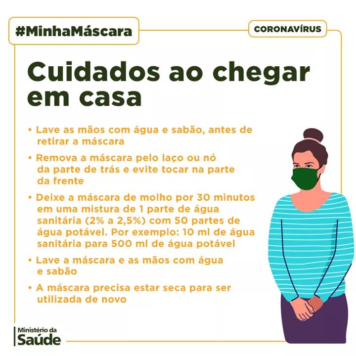 - Ao chegar em casa, lave as mãos com água e sabão, secando-as bem, antes de retirar a máscara.