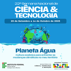 Entre os dias 29 de setembro e 1o de outubro, será realizada a Semana de Ciência e Tecnologia 2025 no IFMG Campus Ouro Branco. Neste ano, a Semana Nacional de Ciência e Tecnologia sugere uma reflexão urgente sobre o tema: "Planeta Água: a cultura oceânica para enfrentar as mudanças climáticas no meu território", um reconhecimento de que o destino da humanidade e dos ecossistemas está intrinsecamente ligado aos recursos hídricos, em especial, dos oceanos que cobrem mais de 70% da superfície terrestre.
