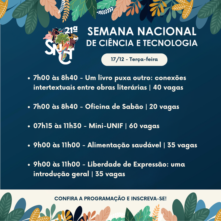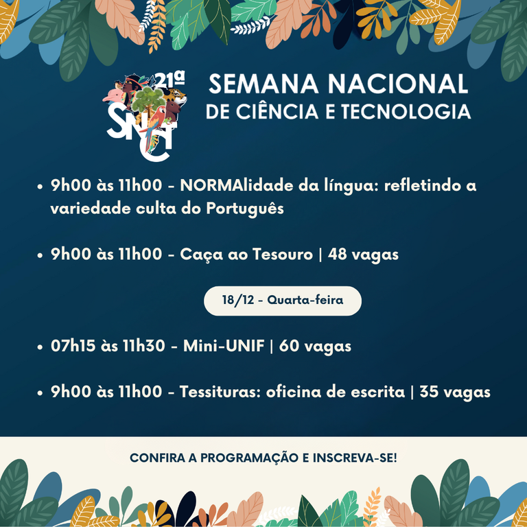 Nos dias 17 e 18 de dezembro, será realizada a Semana de Ciência e Tecnologia no IFMG Campus Ouro Branco. A programação conta com oficinas, rodas de conversa, debates e até um caça ao tesouro.