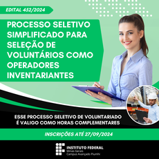 O Instituto Federal de Minas Gerais (IFMG) Campus Avançado Piumhi lançou o edital para o processo seletivo simplificado com o objetivo de selecionar voluntários para atuar como operadores inventariantes no auxílio das atividades do Inventário Anual 2024 de Bens Móveis.