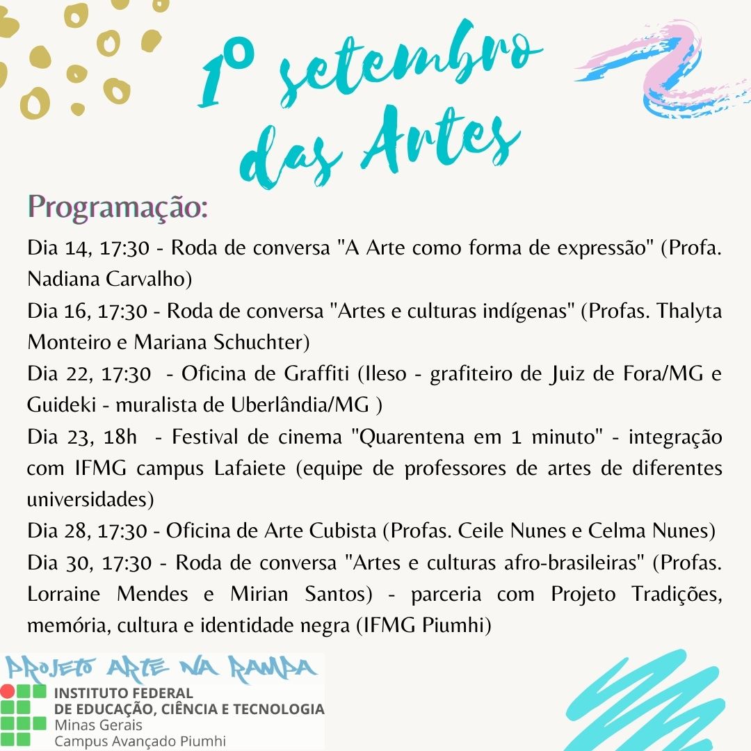 A partir do próximo dia 14 de setembro, o Projeto Arte na Rampa promoverá o 1º Setembro das Artes do IFMG campus Piumhi. O evento acontecerá de forma online, por meio do Google Meet, e contará com a participação de profissionais de várias instituições do país, que estarão presentes em rodas de conversa e oficinas, com diferentes temas relacionados a arte e cultura.
