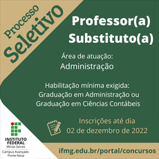 Está divulgado o Edital 29/2022 que trata do PROCESSO SELETIVO SIMPLIFICADO destinado a seleção de candidatos para contrato como PROFESSOR SUBSTITUTO para o IFMG - Campus Avançado Ponte Nova.
