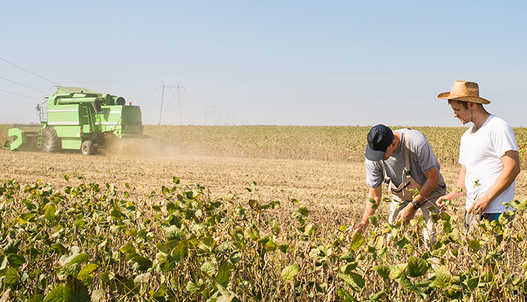 Dois homens/profissionais avaliam plantação com trator ao fundo.