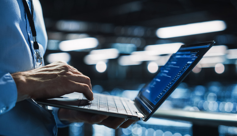 Homem com camisa social e crachá trabalha em notebook.