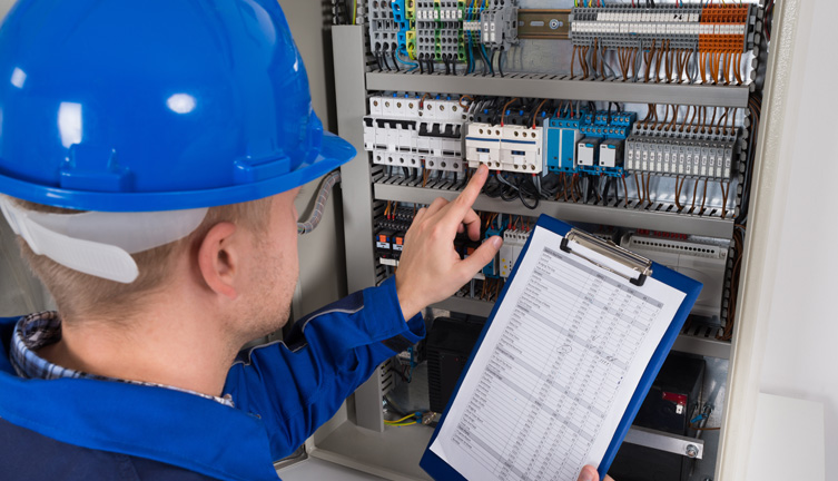 Profissional com capacete e uniforme analisa quadro elétrico enquanto segura prancheta com checklist.
