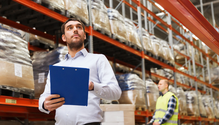 Profissional com prancheta observa corredor de galpão com materiais/estoque e faz anotações.