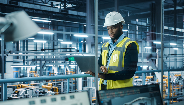 Profissional com equipamento de proteção individual trabalha no computador com indústria/fábrica ao fundo.