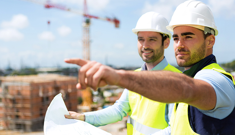 Dois profissionais homens com projeto/planta na mão e construção e guindaste ao fundo.