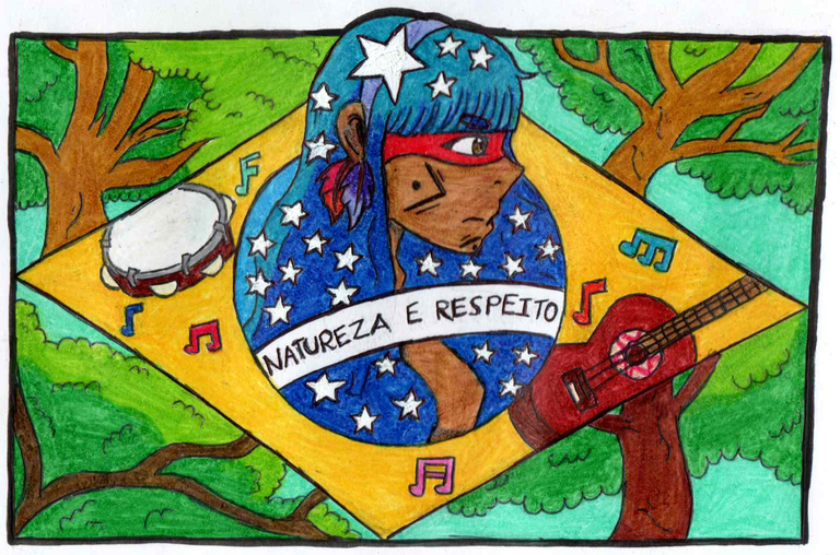 Na parte verde eu desenhei uma floresta. Na época, lembro que estavam fazendo campanhas contra as queimadas na Amazônia, porque a cada ano a porcentagem de área devastada aumentava. Eu desenhei a floresta bem verde e bonita, porque era assim que ela deveria estar: verde, bonita, protegida e respeitada. Por fim, na faixa eu escrevi “Natureza e Respeito”, porque a natureza sempre esteve aqui muito antes de nós e, além de respeitá-la, deveríamos valorizar e respeitar nossa cultura e nossas origens.