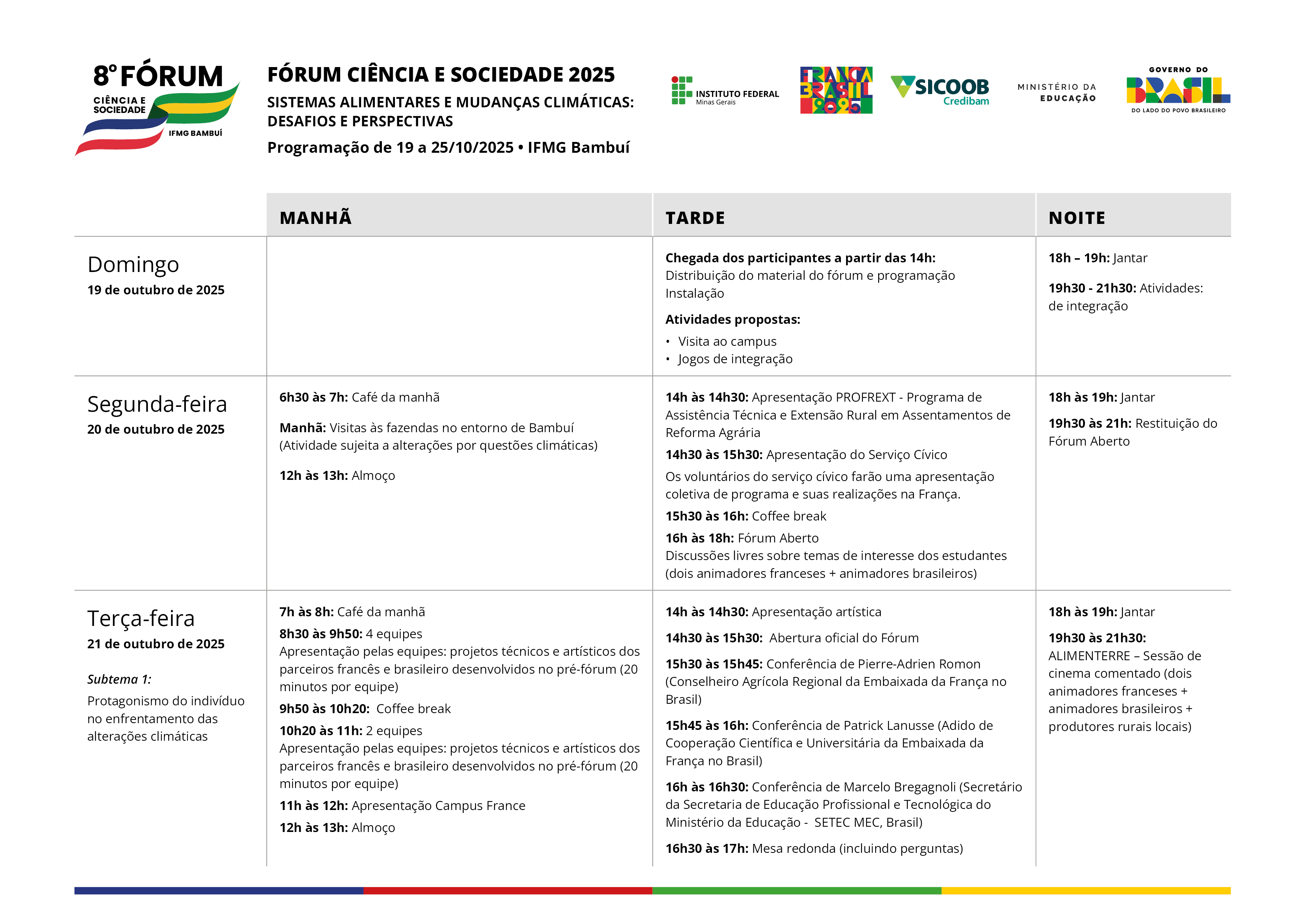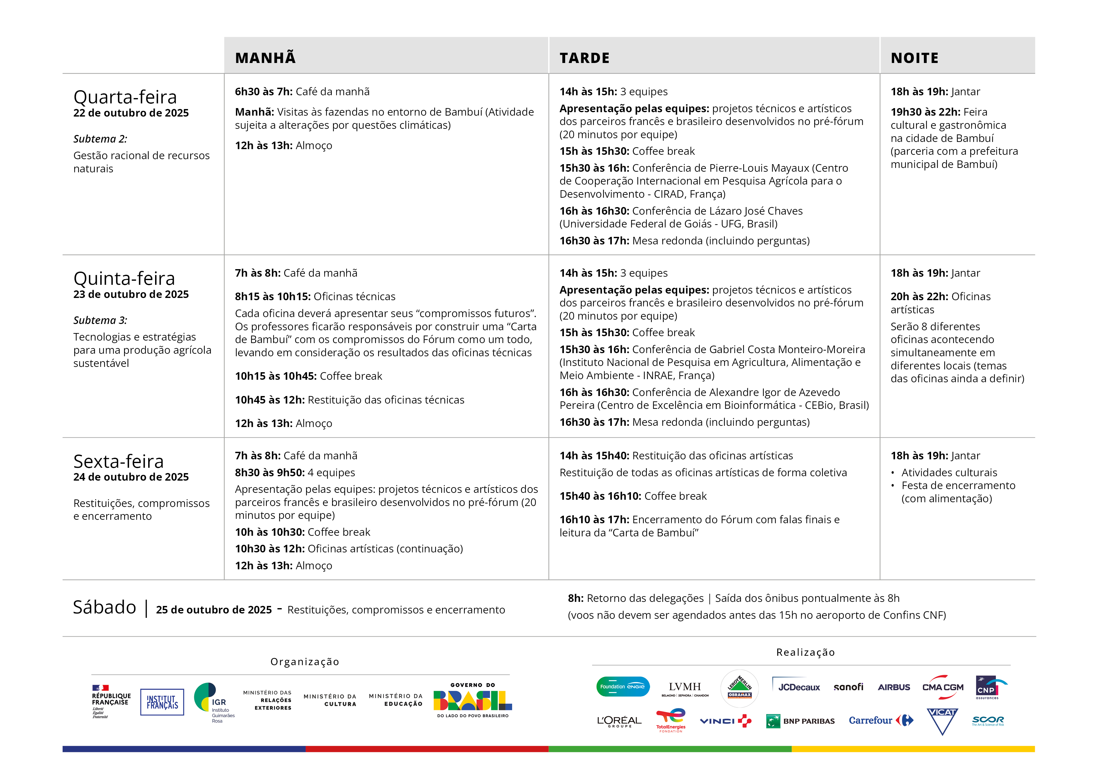 Durante as manhãs, de terça a sexta-feira (21 a 24/10), os participantes apresentarão os projetos técnicos e artísticos desenvolvidos por grupos franco-brasileiros no pré-fórum. As atividades abordarão os três subtemas centrais: Protagonismo do indivíduo no enfrentamento das alterações climáticas; Gestão racional de recursos naturais; Tecnologias e estratégias para uma produção agrícola sustentável. As tardes serão dedicadas às conferências e mesas-redondas, com a presença de especialistas das duas nações.