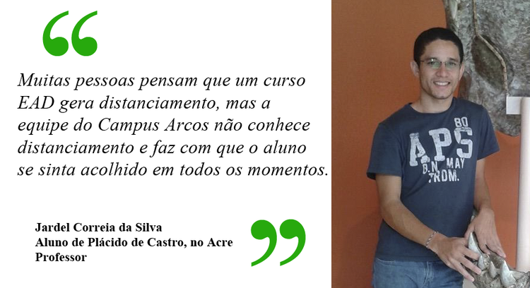 “Estou achando o curso sensacional, primeiro pela atenção que cada aluno recebe. Muitas pessoas pensam que um curso EAD gera distanciamento, mas a equipe do Campus Arcos não conhece distanciamento e faz com que o aluno se sinta acolhido em todos os momentos desde o momento da matrícula. Dá uma leve impressão que nos conhecemos há muitos anos. E segundo, o curso tem ótimo material de apoio, levando sempre o aluno a pensar no teórico e na prática, como aplicar os conhecimentos adquiridos no curso em nossa prática, tendo um foco de preparar o aluno para uma vivência escolar bem ativa”.