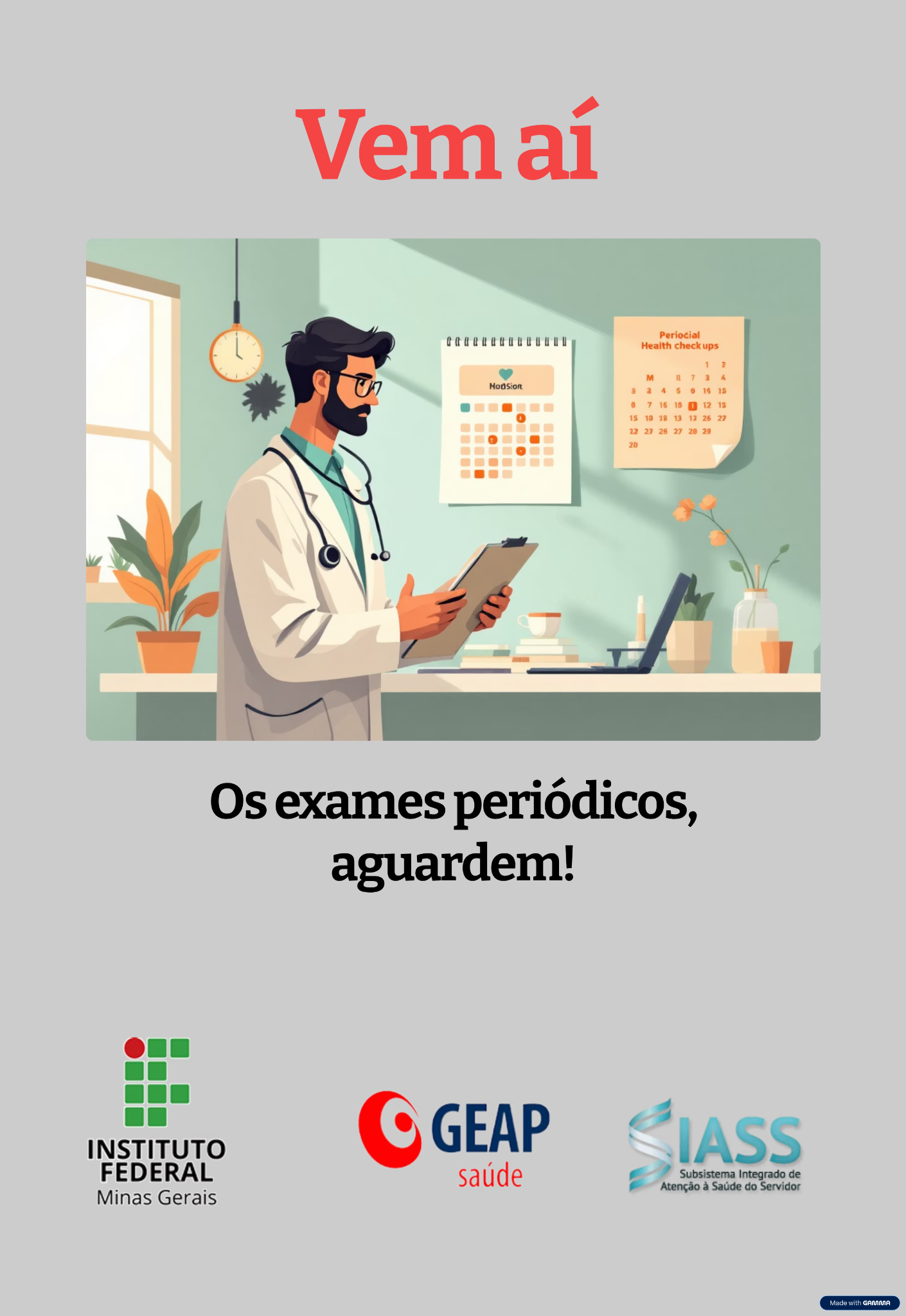 Diante disso, o IFMG iniciará em breve o programa de exames periódicos de seus servidores. O exame médico periódico compreende avaliação clínica e exames laboratoriais, e complementares designados conforme idade, sexo, função pública e o grau de exposição a fatores de riscos nos ambientes de trabalho (físicos, químicos, biológicos e ergonômicos). É muito importante que o servidor mantenha os seus exames periódicos atualizados.