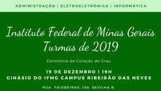 O Instituto Federal de Educação, Ciência e Tecnologia de Minas Gerais Campus Ribeirão das Neves e os formandos dos cursos técnicos integrados ao ensino médio têm a honra de convidar família, amigos e toda a comunidade acadêmica para participarem das solenidades de colação de grau das turmas de 2019.