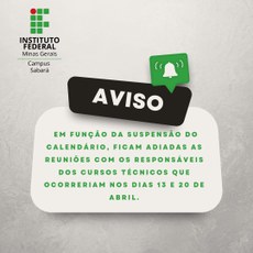 Em função da suspensão do calendário, as reuniões com os responsáveis pelos alunos dos cursos técnicos integrados que ocorreriam nos dias 13 e 20 de abril ficam adiadas. Após a retomada das atividades regulares, as atividades serão reprogramadas.