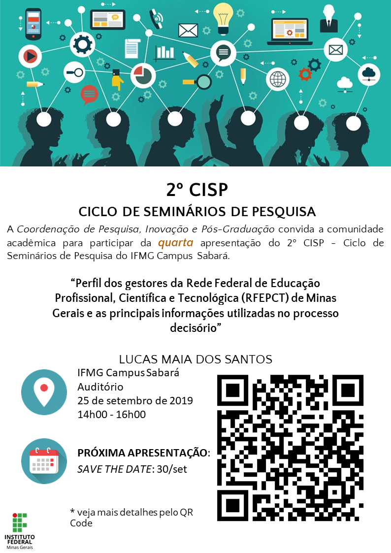 A coordenação de pesquisa, inovação e pós-graduação do campus Sabará tem o prazer de convidá-los para participarem da continuidade do Ciclo de Seminários de Pesquisa do IFMG Sabará (CISP-Sabará) 2019.