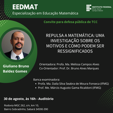 A Especialização em Educação Matemática do IFMG - Campus Sabará tem o prazer de convidar toda a comunidade acadêmica para a defesa do Trabalho de Conclusão de Curso do aluno Giuliano Bruno Baldez Gomes.