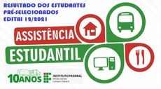 A Diretoria de Assistência Estudantil do IFMG torna público o resultado dos estudantes pré-selecionados do Edital "EDITAL 12/2021 REGULAR PERMANÊNCIA E INCLUSÃO DIGITAL - CAMPUS SABARÁ" do programa de assistência estudantil do IFMG. ORIENTAÇÕES GERAIS: Os estudantes pré-selecionados devem acessar o seu perfil através da plataforma eletrônica SSAE (Sistema de Seleção da Assistência Estudantil) para acompanhar o processo de avaliação.