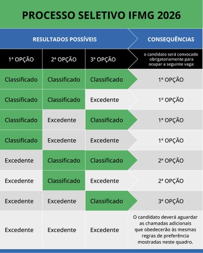De acordo com a Diretoria de Processos Seletivos de Estudantes (DPSE), a medida busca democratizar ainda mais o acesso, oferecendo alternativas que atendam às diversas realidades e expectativas dos estudantes. “É importante fazer uma escolha consciente, ou seja, caso o candidato tenha interesse em apenas um curso do IFMG, sugerimos que ele não selecione outras opções. Agora, se você está em dúvida ou gosta de mais opções, essa possibilidade é perfeita para você”, explica o diretor de Processos Seletivos do IFMG, Tiago Dias.
