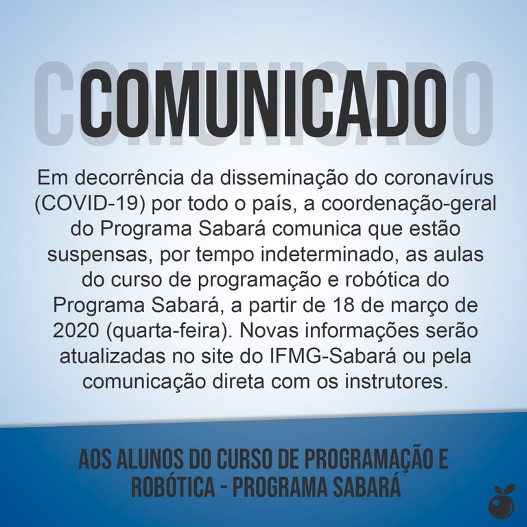 Programa Sabará comunica: Estão suspensas, por tempo indeterminado, as aulas do CURSO DE PROGRAMAÇÃO E ROBÓTICA